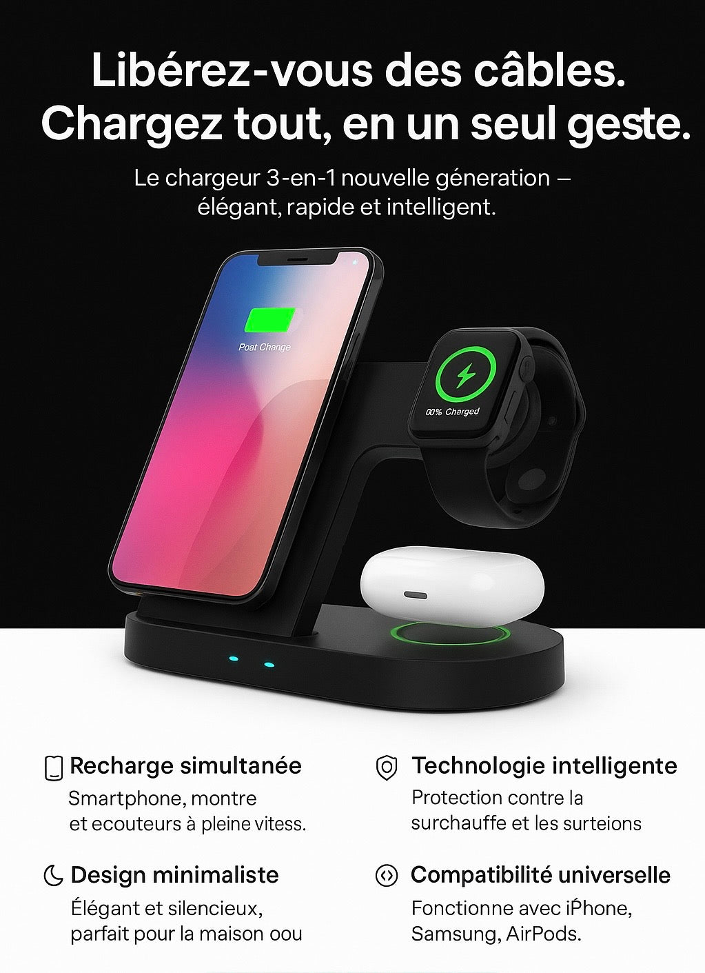 Simplifiez votre quotidien avec nos MagSafes 3 en 1 conçus pour une utilisation rapide, pratique et sans fil.